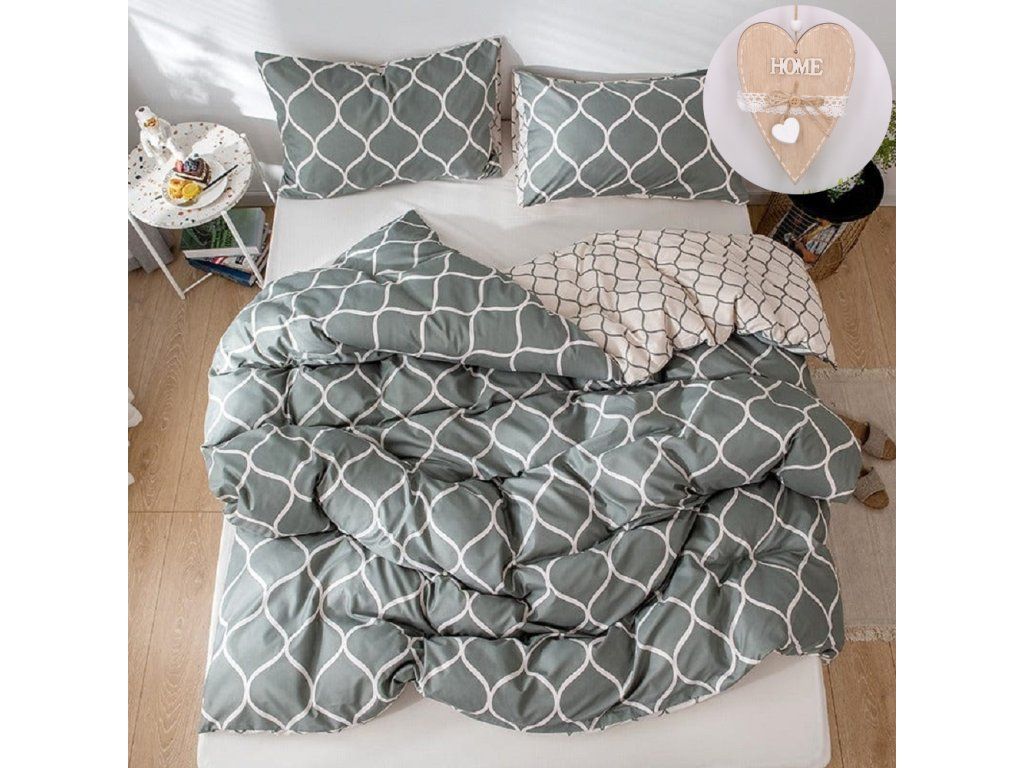 Dizajn v odtieňoch sivej a zelenej doplnený jemnými bielymi geometrickými tvarmi pôsobí elegantne a zároveň útulne. Vďaka tomu sa hodí do modernej spálne, kde chcete dosiahnuť pokojný a reprezentatívny vzhľad. Zapínanie na zips zabezpečuje jednoduché prezliekanie a pevné uchytenie prikrývky i vankúšov.
