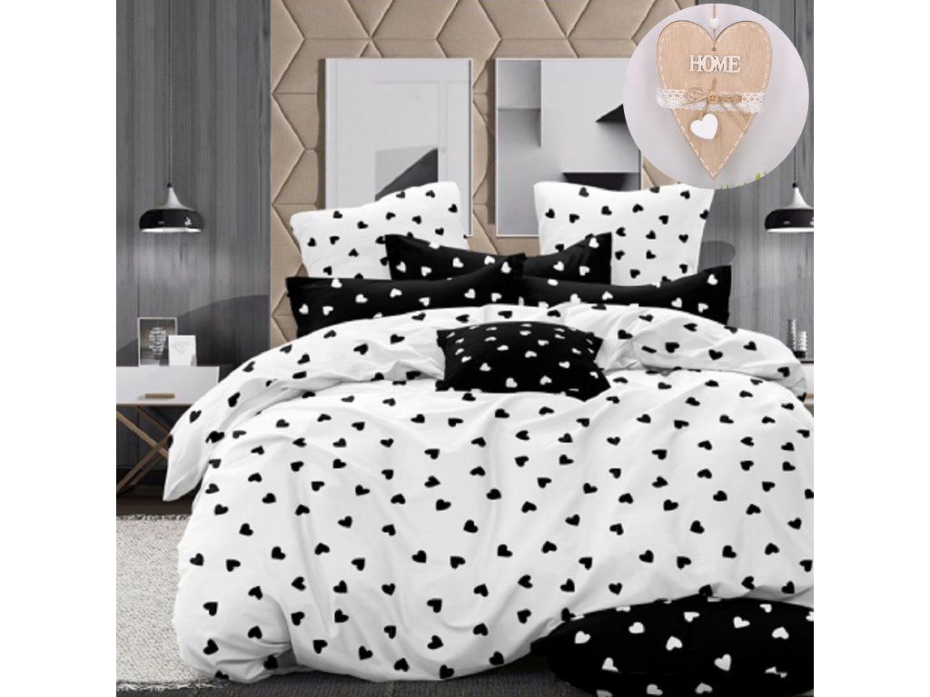 Dizajn “ANABELLA” prináša atraktívne riešenie s obojstranným motívom: jedna strana s tmavým podkladom a bielymi srdiečkami, druhá strana so svetlejším podkladom a čiernymi srdiečkami. Tento detail umožňuje jednoduché prispôsobenie výzoru spálne podľa nálady alebo ročného obdobia.